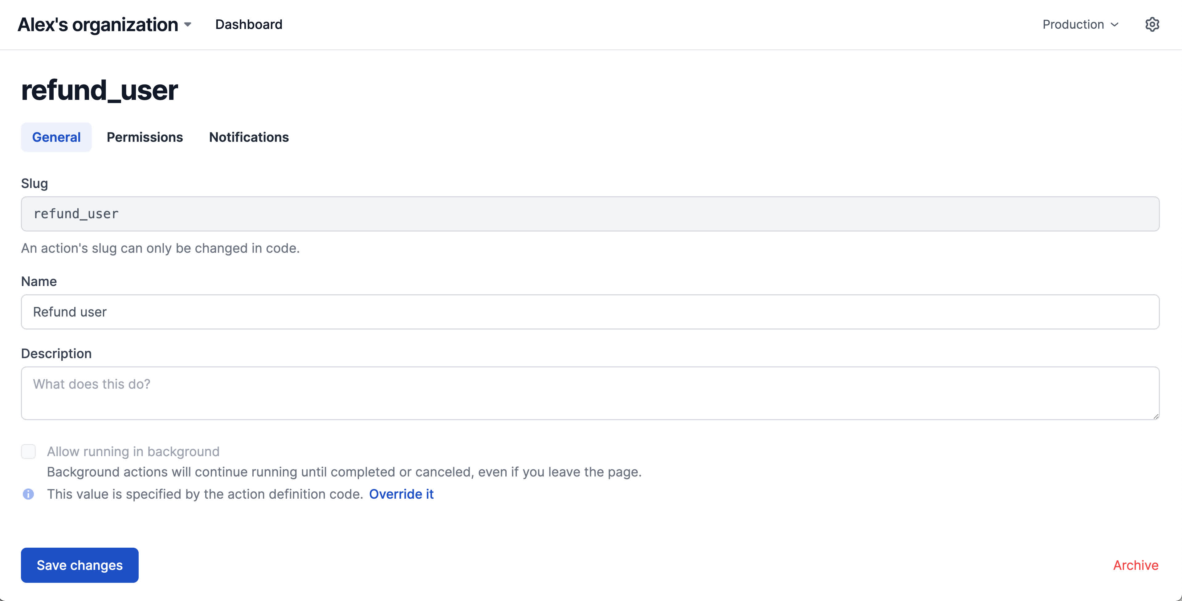 Hover over the action and click the gear to visit the action's configuration page. Interval has automatically suggested a name for this action based on its slug, but you can edit this and optionally provide a description before publishing. From this screen, you can also configure other important functionality like restricting access to the action to only certain teams within your organization.