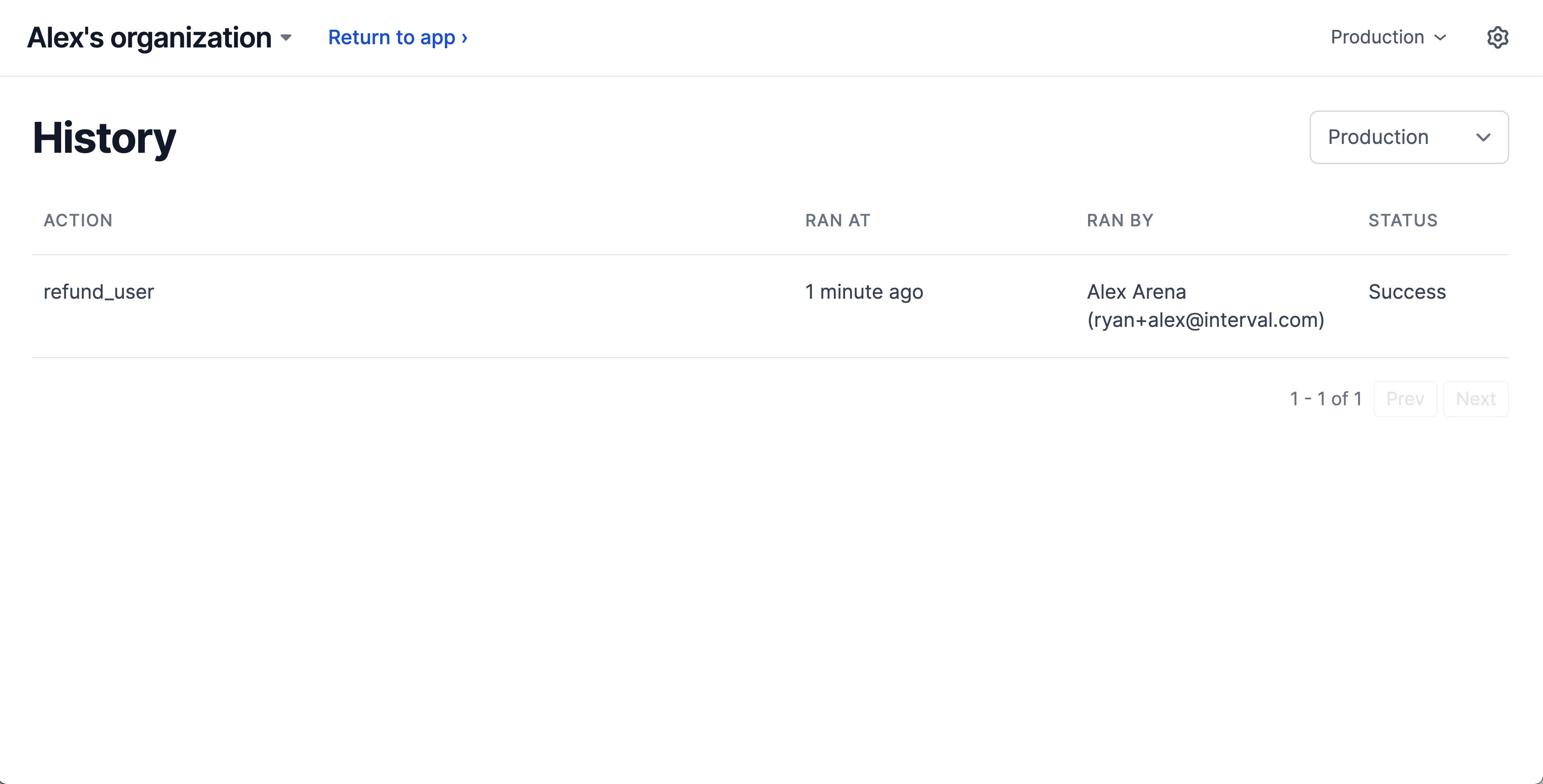Navigating to the Action history page will display a complete history of action runs throughout your organization. It's important to note that Interval can only log what you return from your action. Our security model means that we're unable to see your code by design.