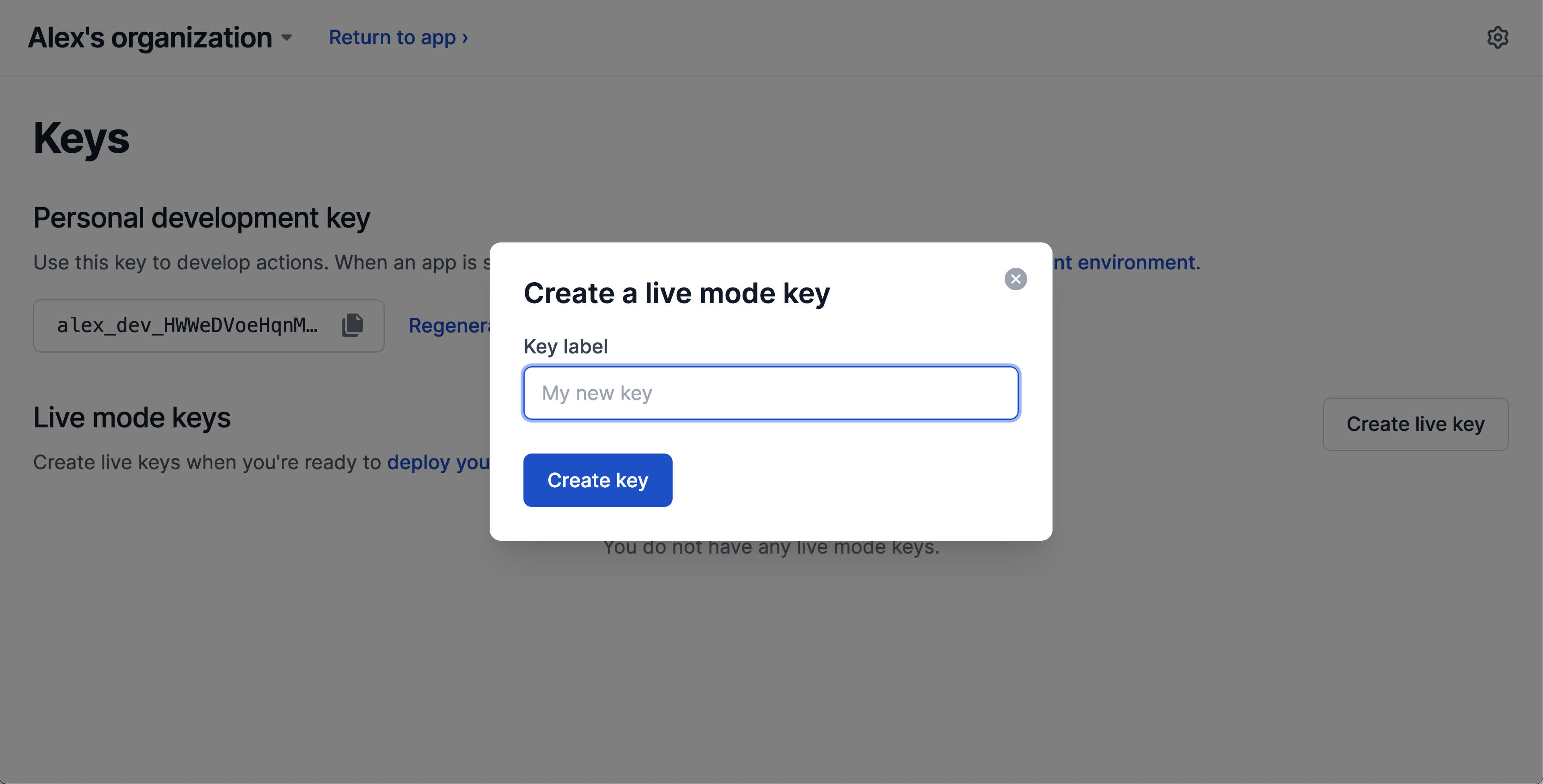 From the Interval dashboard, return to the Keys page and choose Create live key. Enter a label for the key and press Create key.