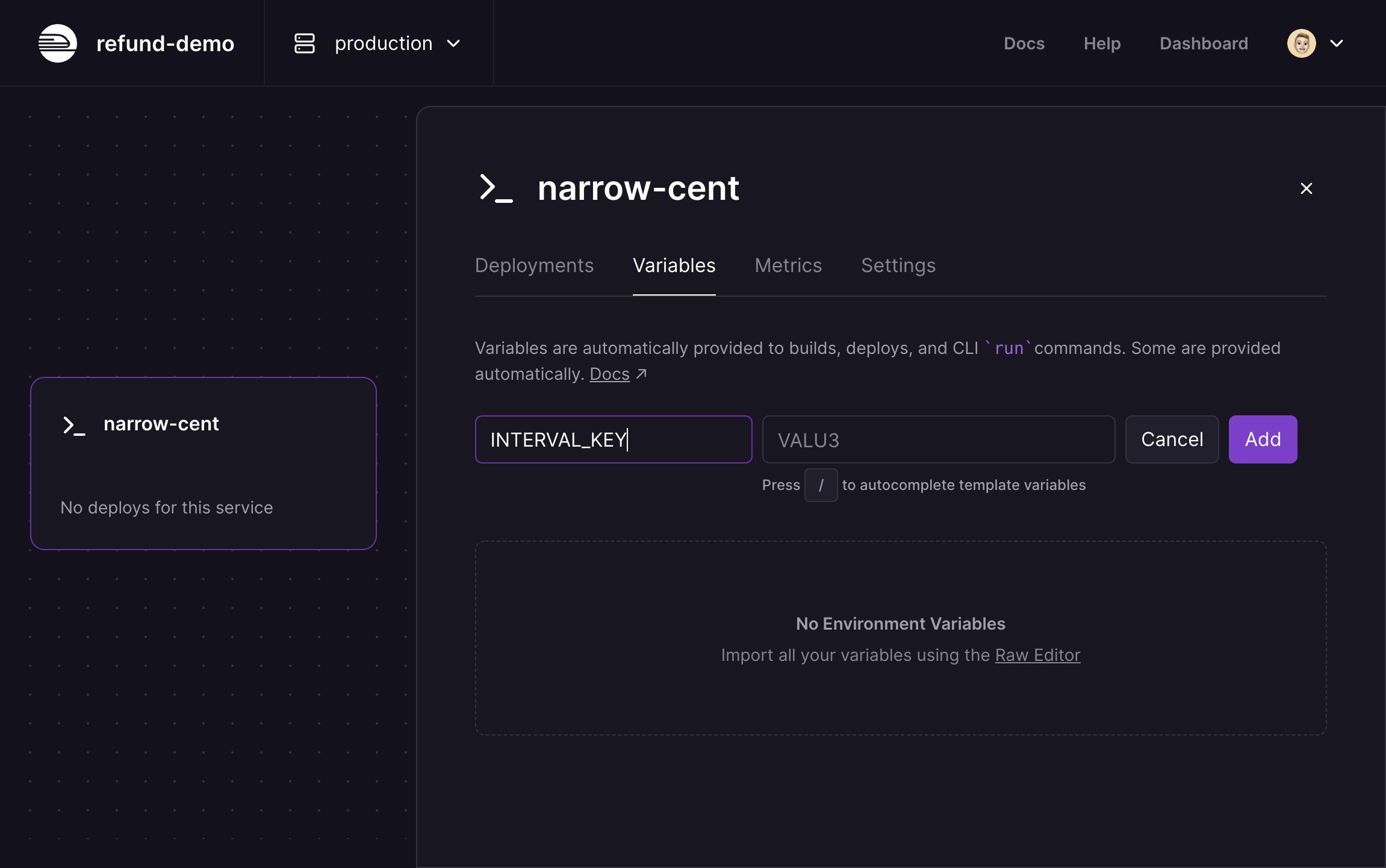 Now, let's move back to the Railway dashboard. Click on your project, choose Add a Service and choose Empty Service. This will create a new Railway service with a random name. Click the newly created service, then Variables and New Variable and paste the Interval API key that's on your clipboard as INTERVAL_KEY