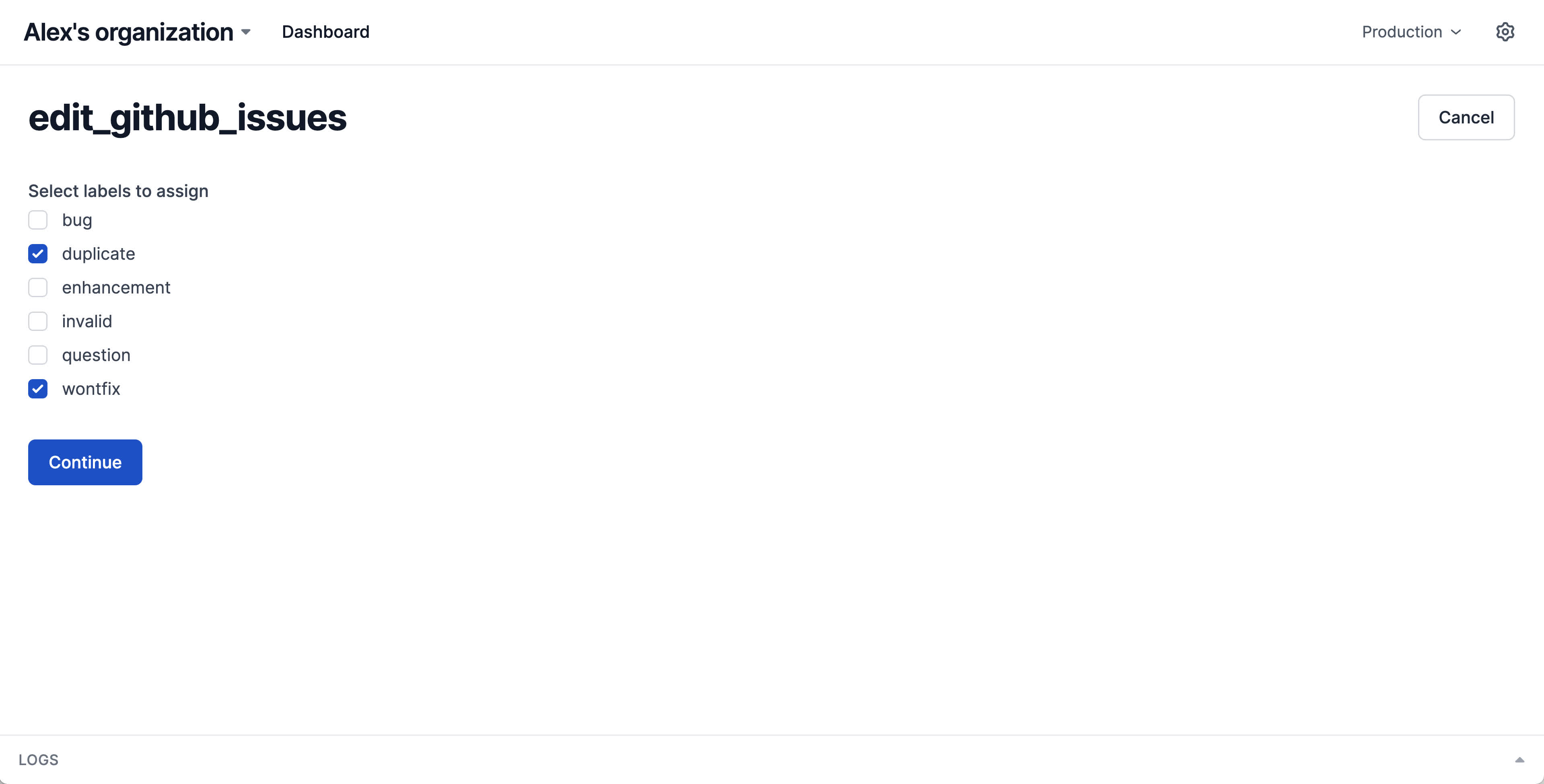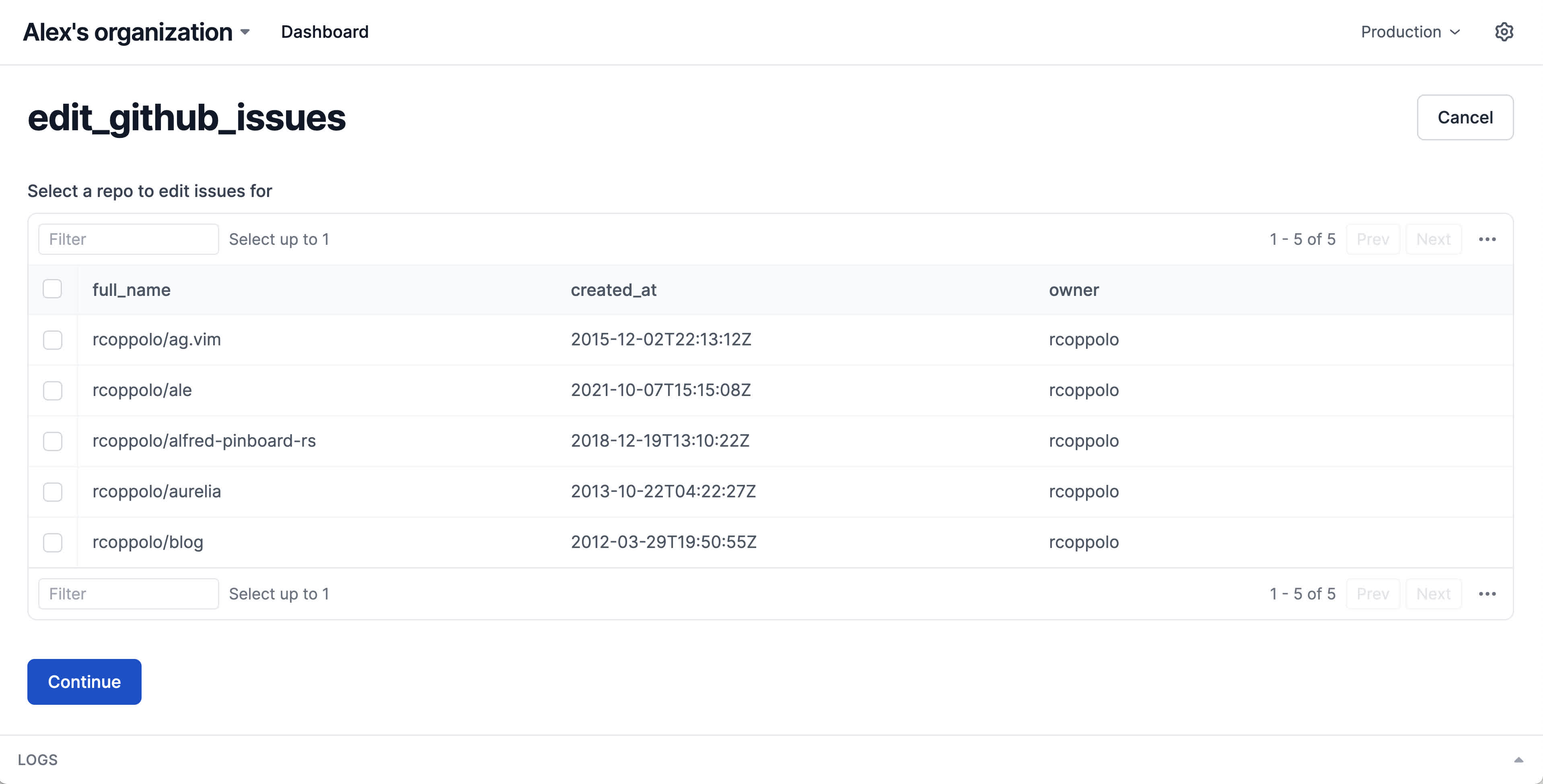 Interval works right in your existing codebase and integrates seamlessly with any external APIs you're using. This example demos a tool that leverages GitHub's API. It supports selecting and managing multiple issues at once within your repositories, all via a dynamic UI generated automatically by Interval.
