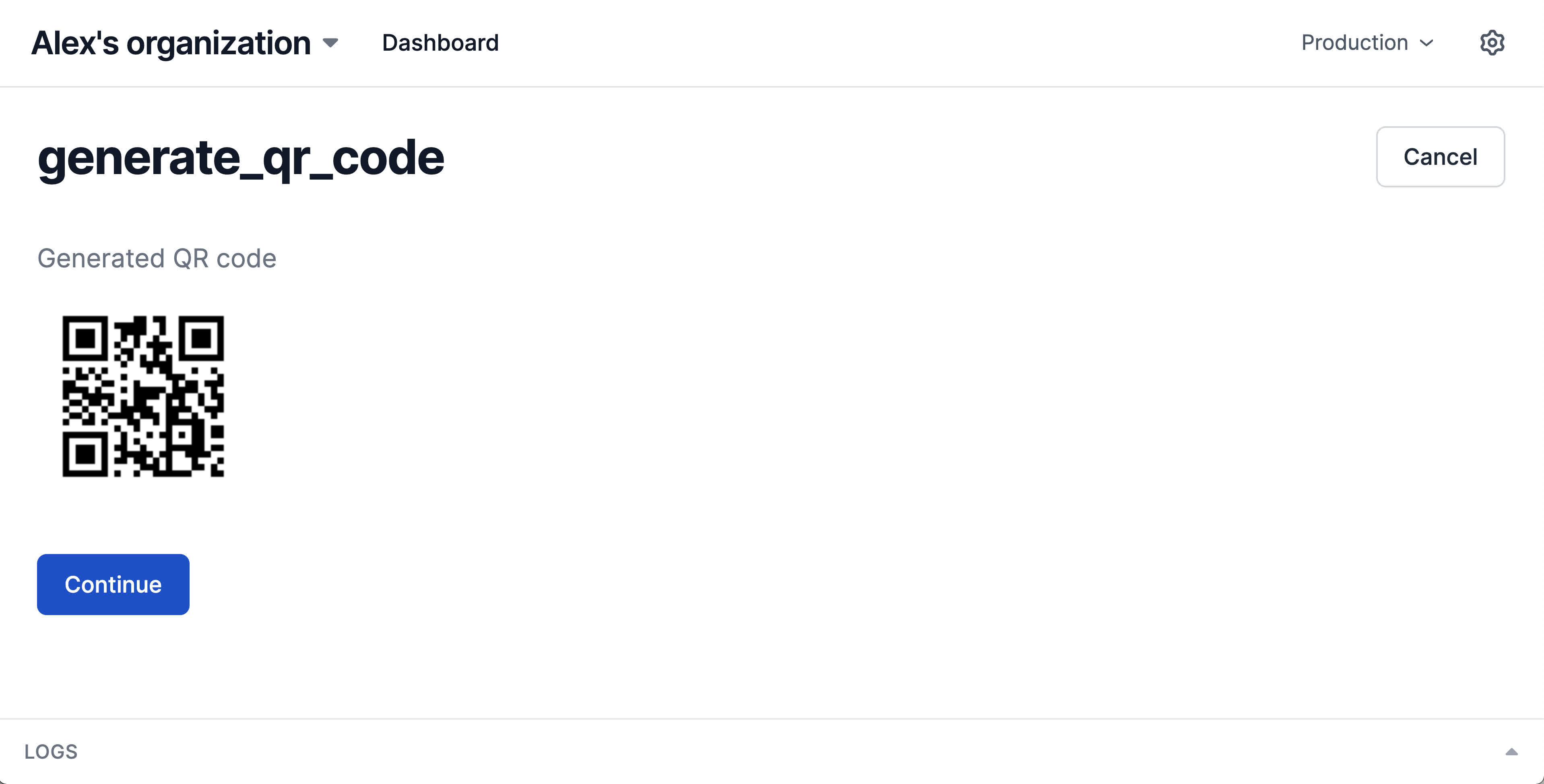 Next we'll import our QR code Node library and use it to generate a code for the provided URL. Since Interval supports rendering images to the person running the action via a simple Node Buffer, there's no need to save or manage the image outside of our action handler.